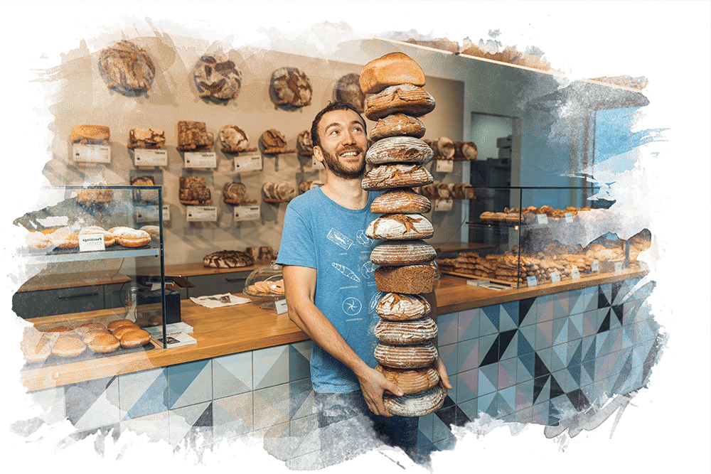 Probier dich durch: Natursauerteigbrot, von mild bis würzig, dann ein Brot aus gekeimtem Dinkelkorn. Oder hast du einen Liebling? Zum Beispiel Roger Roggen: mal glatt, mal mit Sprüngen, wo sich doch eine Kruste bilden wollte. Nimm ein Sackerl voll Gebäck dazu. Das gedrehte mit Fenchel soll unbedingt rein. Es ist noch Platz – für eine Christine Croissant zum Kaffee? Sie raschelt so köstlich und ist wie alle unsere Süßen aus Dinkel.